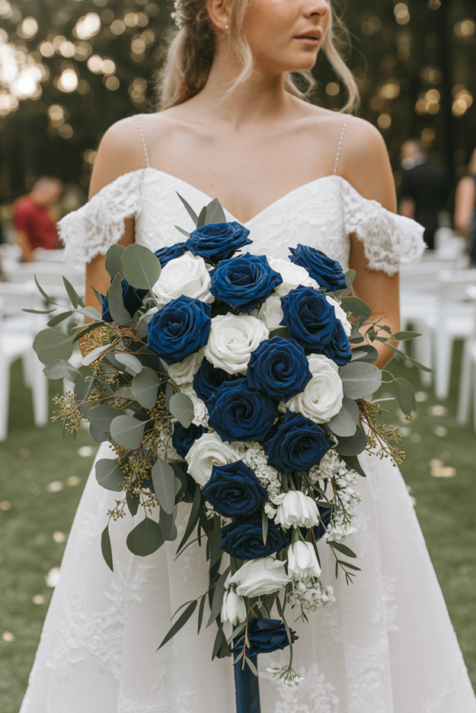 This dramatic blue and white cascading bouquet creates a striking focal point, blending deep navy roses with crisp white blooms for a rich, romantic contrast. The arrangement flows downward with soft greenery and delicate accent flowers, giving the bouquet movement and an effortlessly luxurious feel as it drapes against the bride’s gown.