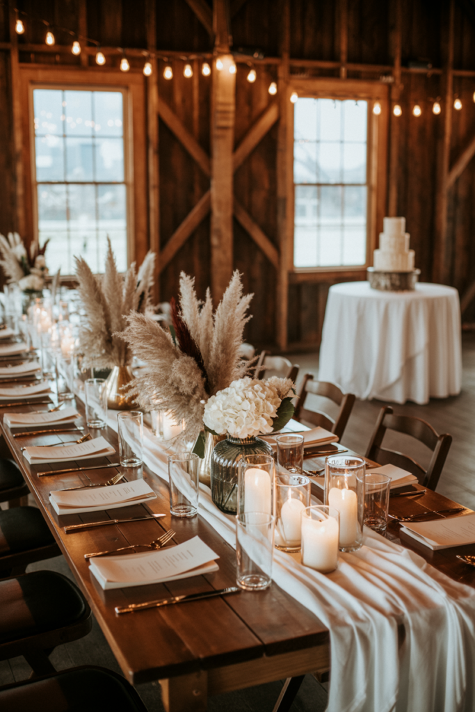 This pampas grass centerpiece creates a soft, romantic statement that fits beautifully inside rustic barn venues. Tall, feathery pampas plumes paired with neutral flowers and glass candle holders add height and texture while still keeping the table design airy and elegant. The natural tones of dried grasses complement wooden tables, linen runners, and warm string lights overhead, creating a cozy yet sophisticated atmosphere.