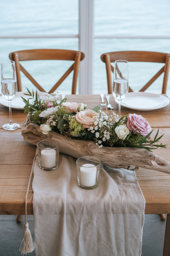 Pair the arrangement with a soft linen runner and a few small votive candles to create a warm, romantic glow across the table. Driftwood centerpieces work especially well for barn weddings near lakes or coastal venues because the raw wood texture blends beautifully with natural surroundings while still allowing delicate flowers to stand out.