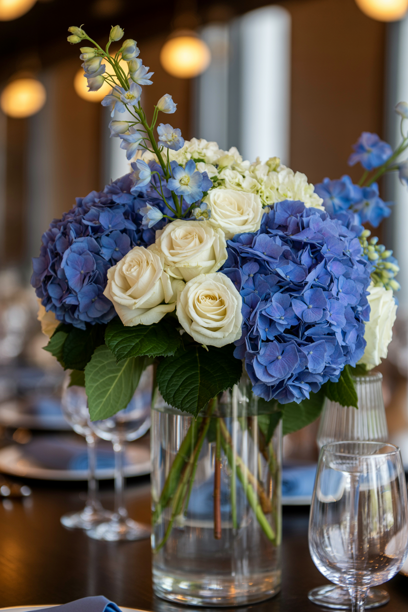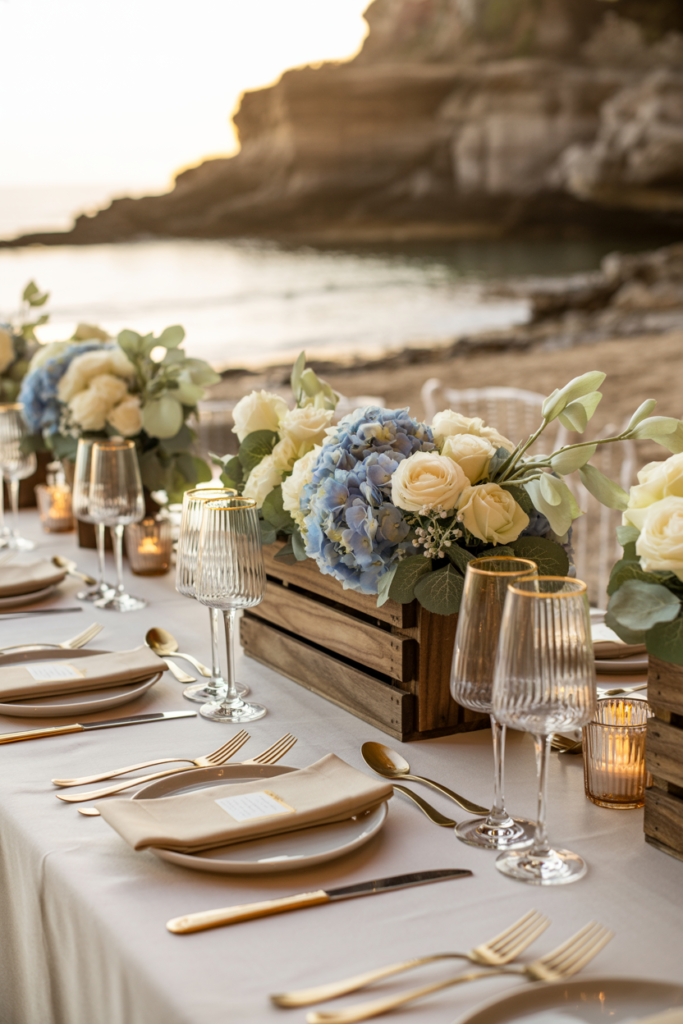 A wooden crate centerpiece brings a beautiful rustic texture that fits perfectly with barn or outdoor wedding settings. Filled with soft hydrangeas, roses, and greenery, the crate creates a natural, layered arrangement that feels both elegant and relaxed. Wood elements like crates are commonly used in rustic wedding decor because they add warmth and connect the table design to the natural surroundings.