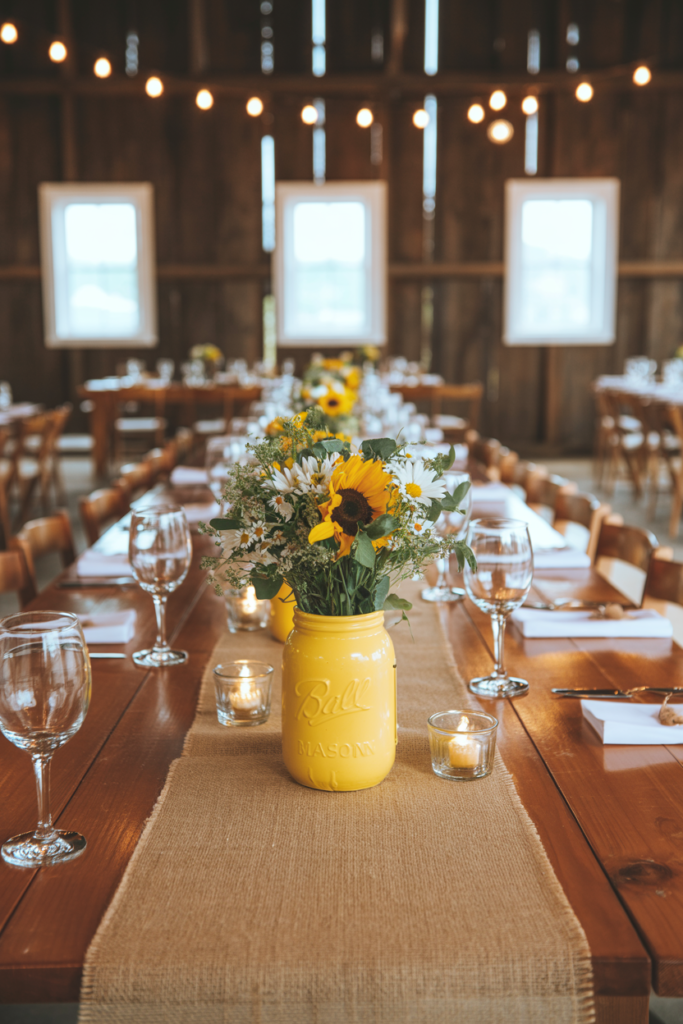 For a budget-friendly option that still looks full and vibrant, faux sunflowers work wonderfully and last all day without wilting. These faux sunflower stems are a great choice for filling each jar and creating a consistent look across the reception tables. Artificial sunflowers are commonly used in wedding decor because they hold their shape and color throughout the event, making them a reliable centerpiece option.