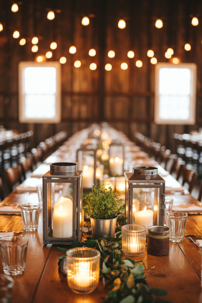 This candle lantern centerpiece creates a warm, intimate atmosphere that feels perfectly at home in a rustic barn reception. A mix of lanterns, glowing votive candles, and soft greenery running down the center of the table adds texture and depth while keeping the look simple and romantic. Lantern centerpieces are especially popular for barn weddings because the candlelight adds a cozy glow that works beautifully with wood tables and string lights overhead.