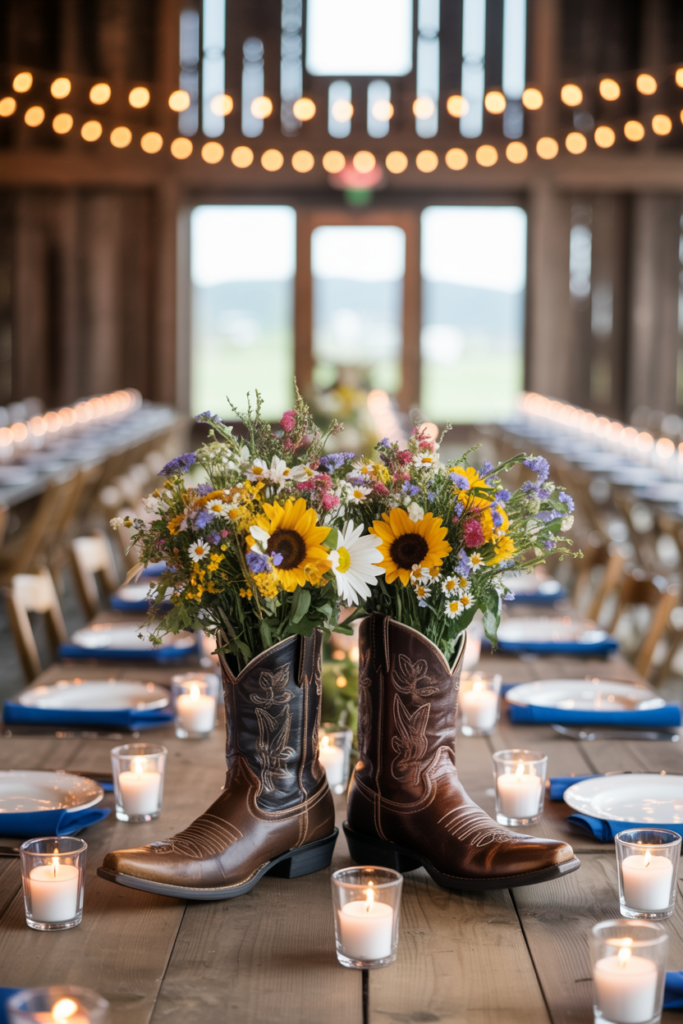 This western-inspired centerpiece is perfect for a rustic barn wedding with a country twist. A pair of cowboy boots filled with wildflowers instantly creates a fun, memorable focal point that fits beautifully with wooden tables, candlelight, and string lights overhead. Boot centerpieces are popular for western or ranch-style weddings because they add personality while still feeling relaxed and rustic. Cowboy boot vases and planters are commonly used for floral arrangements and decorative centerpieces in western-themed decor.
