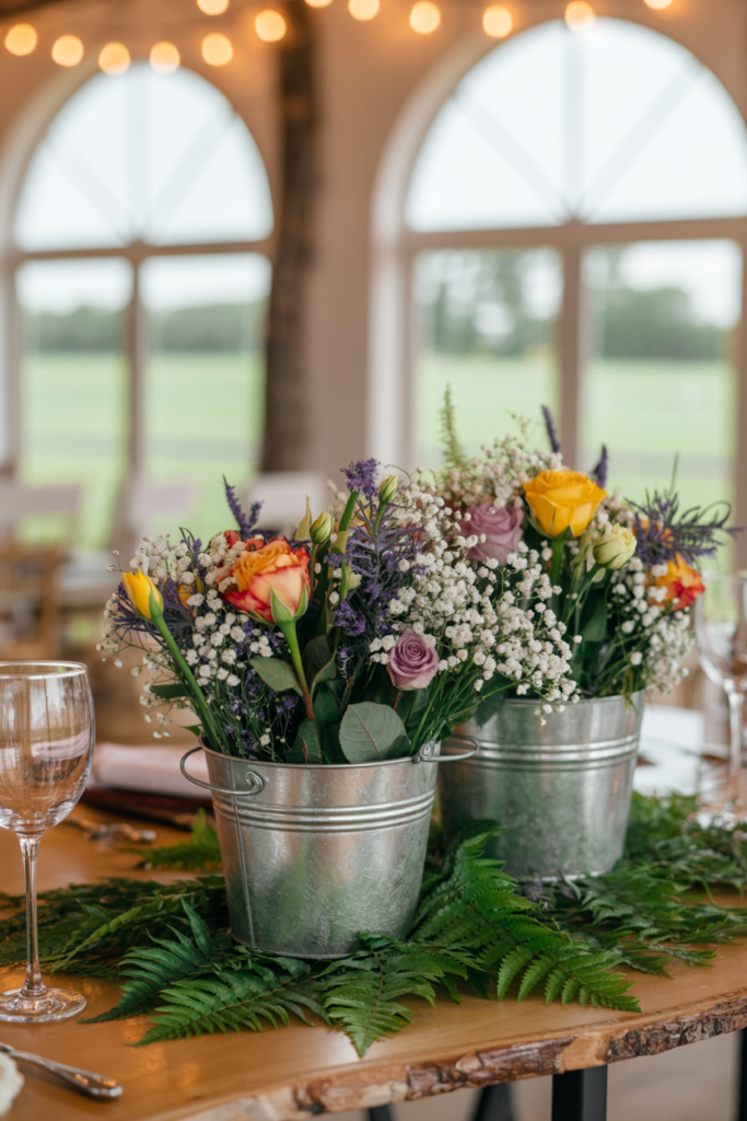 Galvanized buckets make a charming and effortless choice for rustic barn wedding centerpieces. The simple metal texture pairs beautifully with wooden tables, greenery, and soft candlelight, creating that relaxed farmhouse atmosphere many couples love. Fill each bucket with a loose mix of seasonal flowers and greenery to create a centerpiece that feels fresh, colorful, and perfectly suited to a countryside celebration.