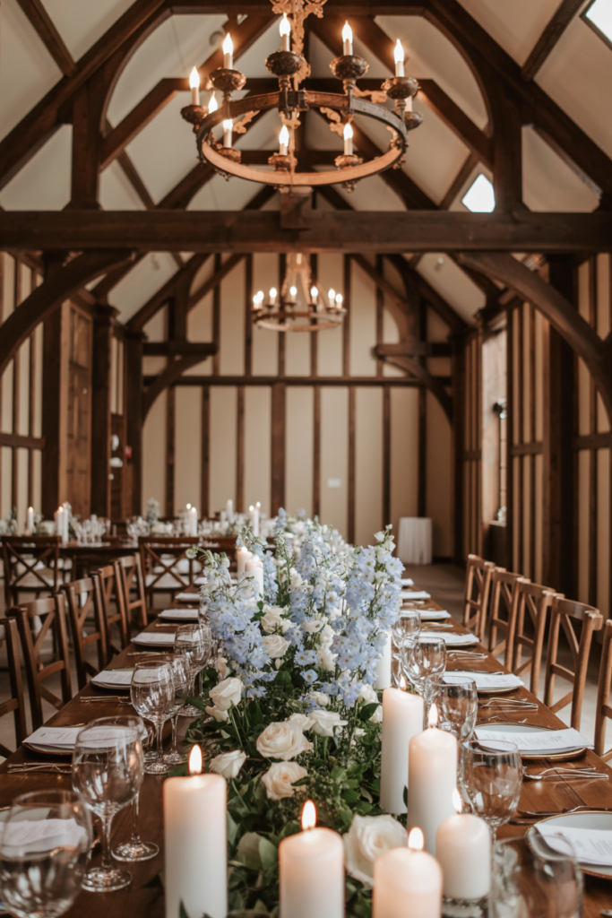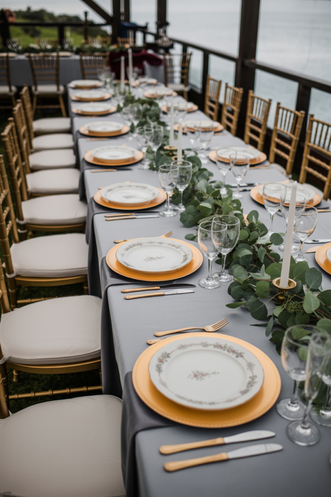 A eucalyptus garland centerpiece is one of the easiest ways to create a beautiful, cohesive barn wedding table. Instead of placing individual centerpieces at each setting, a soft greenery runner flows down the entire length of the table, creating a natural, organic look that pairs perfectly with candlelight, wood tables, and open-air barn venues. Eucalyptus is especially popular for wedding decor because its soft green leaves add texture while still keeping the design simple and elegant.