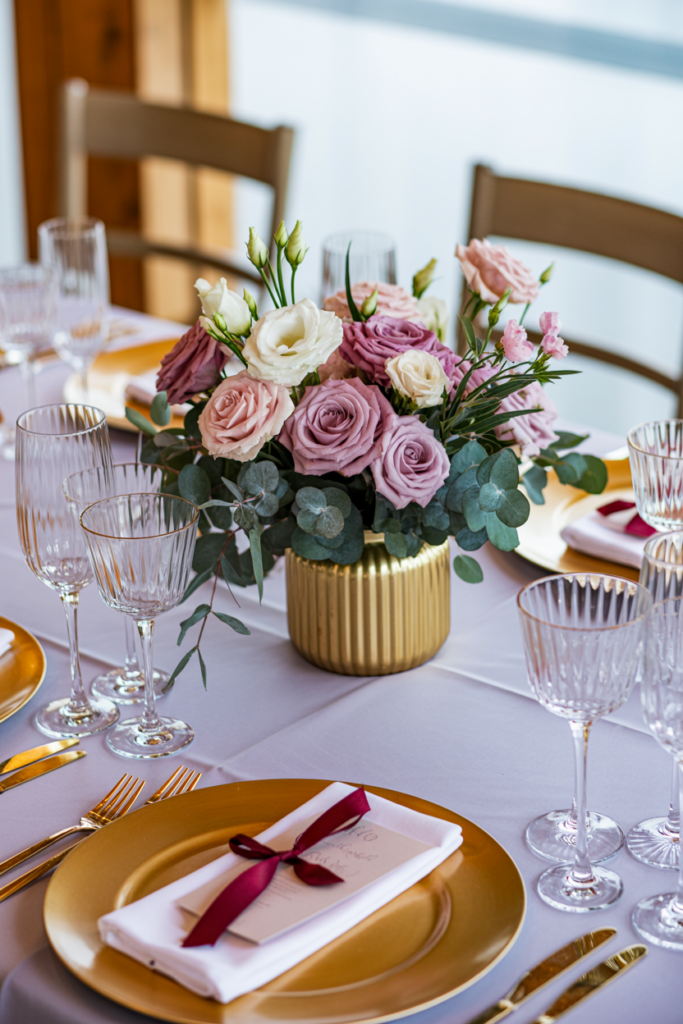 This gold vase centerpiece adds a soft, romantic touch to a rustic barn wedding while still feeling elegant and elevated. A small gold vase filled with blush roses, white blooms, and eucalyptus creates a beautiful contrast against simple linens and wooden tables. The warm metallic finish reflects candlelight and glassware, helping the entire table setting feel polished while still keeping that relaxed barn wedding charm.