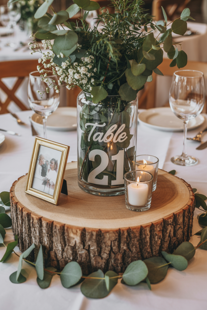 Wood slice centerpieces are a classic choice for rustic barn weddings because they instantly add natural texture and warmth to the table. A simple wood round creates the perfect base for layering decor—like a mason jar filled with eucalyptus and baby’s breath, small votive candles, or even a framed photo and table number. The natural bark edges and wood grain give every table a slightly unique look while still keeping the overall design cohesive and earthy. Wooden slices are especially popular in rustic wedding decor because they highlight natural materials and provide a sturdy base for candles, vases, or floral arrangements.