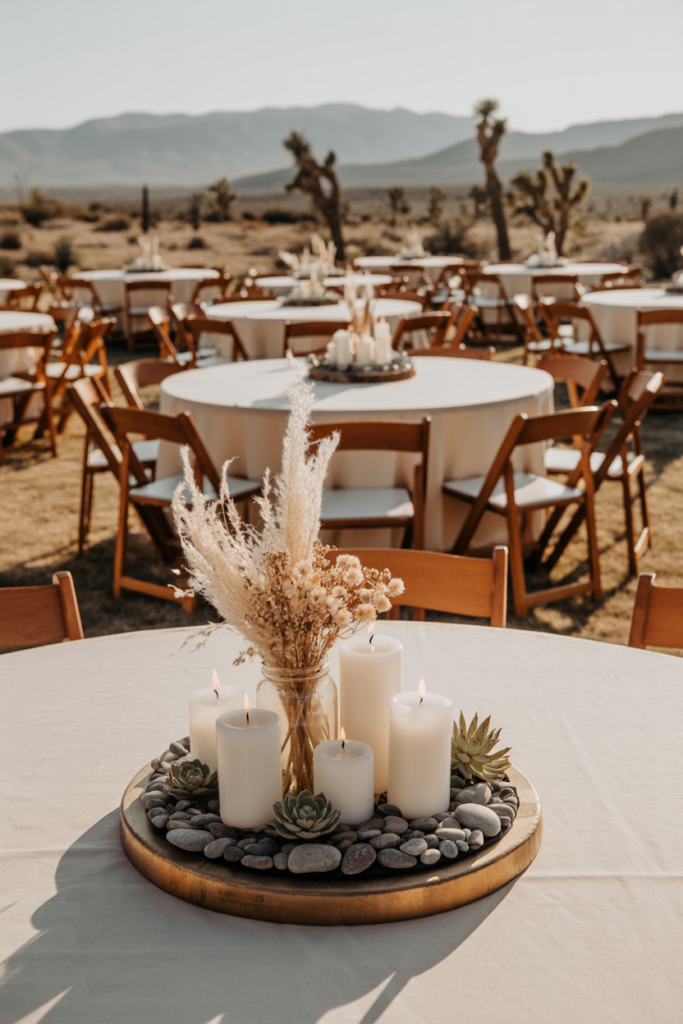 To recreate this look, start with a rustic base like this round wooden centerpiece tray. Place a small vase of dried florals or pampas grass in the center, then surround it with pillar candles, small succulents, or decorative stones. The tray keeps everything contained while creating a layered, natural centerpiece that works beautifully for barn, desert, or outdoor weddings.