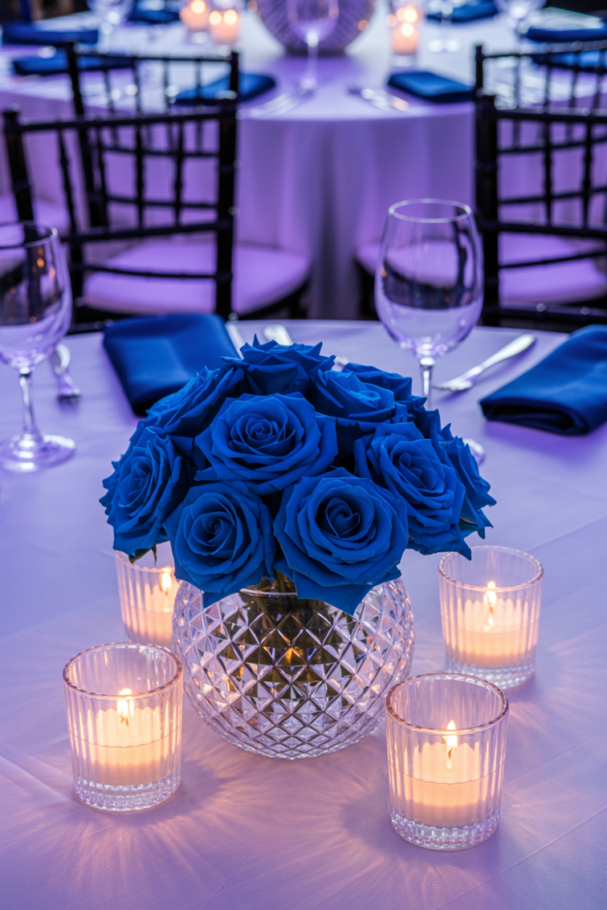 A compact arrangement of rich royal blue roses creates a bold and romantic wedding centerpiece that instantly draws attention. Set in a textured crystal vase and surrounded by soft candlelight, the deep blue blooms feel luxurious while still keeping the table design clean and refined. The glow from the votive candles reflects through the glass and highlights the dramatic color palette, making this centerpiece perfect for evening receptions or ballroom weddings where moody lighting and jewel tones take center stage.