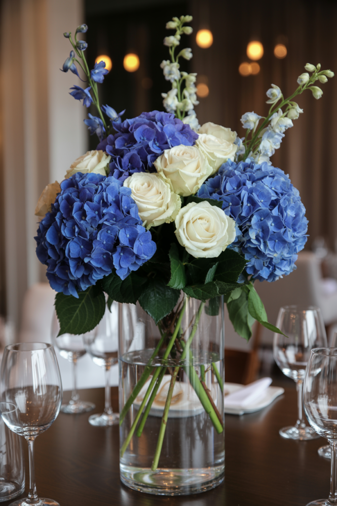 Soft blue hydrangeas paired with classic white roses create a timeless wedding centerpiece that feels both elegant and fresh. Arranged in a tall clear glass cylinder vase, the lush blooms bring volume and texture to the table while keeping the overall design clean and sophisticated. Delicate blue delphinium stems add height and movement, making the arrangement feel light and airy. This style works beautifully for romantic ballroom receptions, garden-inspired weddings, or any celebration where soft blue tones and classic florals set the mood.
