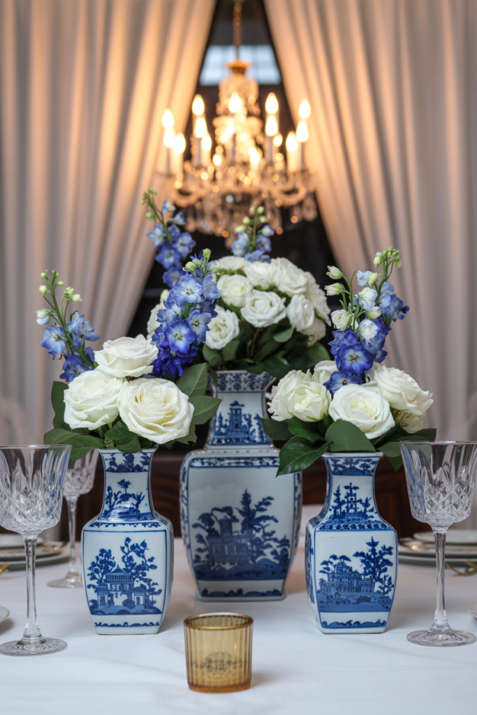 For couples drawn to timeless elegance, blue and white porcelain vases make a stunning royal blue wedding centerpiece. This arrangement pairs delicate white roses with vibrant blue delphinium stems, creating a balanced mix of softness and color that feels both classic and fresh. Grouping several patterned porcelain vessels together adds depth to the table while allowing each floral arrangement to feel intentional rather than overly formal. When paired with crystal glassware, candlelight, and soft draping in the background, the result is a centerpiece that feels refined, romantic, and effortlessly sophisticated.