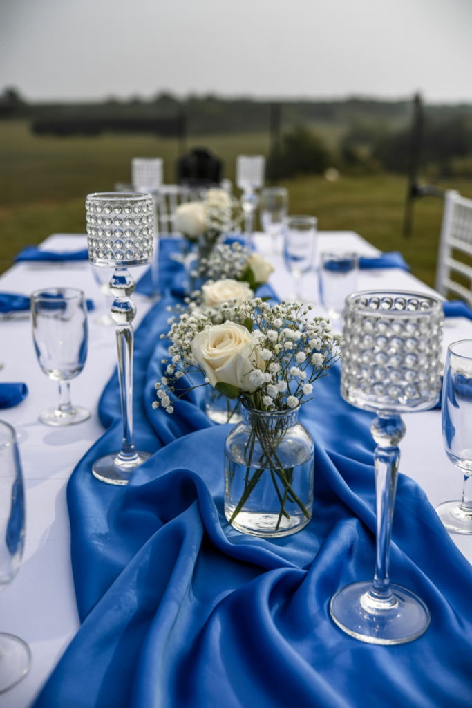 A flowing royal blue table runner instantly adds drama to an otherwise minimal wedding table. Here, small glass vases filled with white roses and delicate baby’s breath create an airy centerpiece that keeps the bold color from feeling overwhelming. Crystal candle holders and glassware reflect the light beautifully, giving the entire tablescape a soft glow. This style works especially well for outdoor weddings, where the vibrant blue fabric contrasts elegantly against natural scenery while keeping the overall look fresh and romantic.