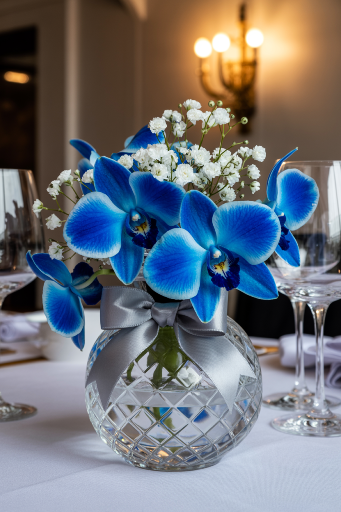 Bold blue orchids create a striking royal blue wedding centerpiece that instantly draws attention to the table. Arranged in a cut crystal vase and accented with delicate baby’s breath, the vibrant blooms bring a modern yet elegant touch to the setting. A soft satin ribbon tied around the vase adds a refined detail that pairs beautifully with formal table settings and candlelit reception spaces. This type of arrangement works especially well for couples who want their centerpieces to feel luxurious while still keeping the design simple and focused on a few dramatic flowers.