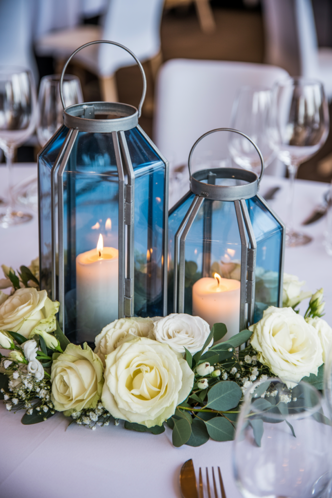 Blue glass lanterns with soft candlelight create a romantic royal blue wedding centerpiece that feels warm and inviting. Surrounded by elegant white roses and greenery, the lanterns bring a gentle glow to the table while adding a subtle pop of color that ties beautifully into a blue wedding palette. Faux florals can make recreating this look simple and budget-friendly—these artificial white roses help achieve the same lush look without worrying about delicate flowers wilting during a long reception. This centerpiece style works beautifully for both indoor and outdoor weddings, combining candlelight, soft florals, and rich blue accents for a timeless table design.