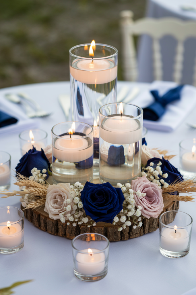 For couples planning a rustic or outdoor celebration, this royal blue centerpiece blends candlelight with natural textures for a warm, romantic look. Floating candles in clear glass cylinders sit atop a wood slice base, surrounded by deep blue roses, soft blush blooms, baby’s breath, and touches of wheat for a slightly organic feel. The mix of glowing candlelight and rich blue florals creates a centerpiece that feels both cozy and elegant. This style works especially well for barn weddings, vineyard venues, or outdoor receptions where natural elements help the tablescape feel relaxed yet beautifully styled.