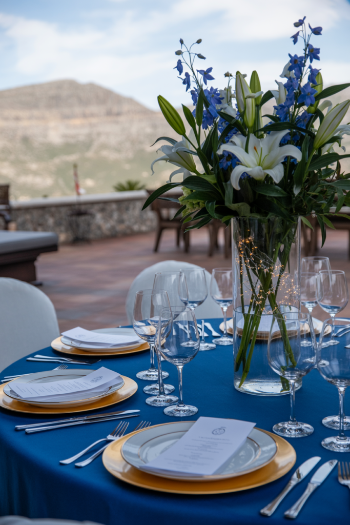 A tall glass vase filled with white lilies and royal blue delphinium creates a centerpiece that feels both refined and effortlessly dramatic. The height of the arrangement draws the eye upward while leaving plenty of space on the table for place settings, glassware, and candlelight. Subtle string lights woven inside the clear vase add a soft glow that becomes especially beautiful as the evening sets in. Paired with deep blue linens and gold-rimmed plates, this centerpiece style works beautifully for elegant outdoor receptions or scenic destination weddings.