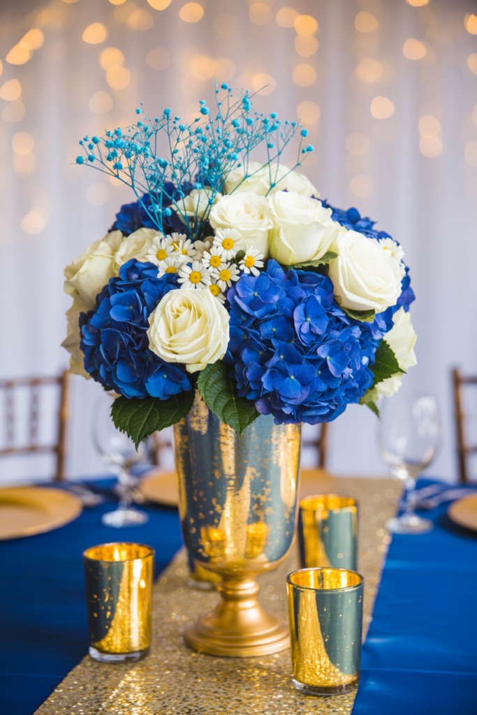 Royal Blue Hydrangea and Gold Vase Wedding Centerpiece