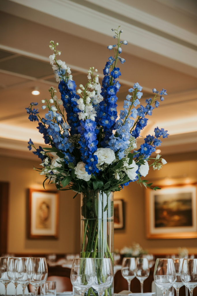 Tall arrangements featuring royal blue delphinium create a dramatic and elegant focal point for wedding reception tables. The vertical lines of the blooms add height and movement, while soft white roses and greenery balance the deep blue tones beautifully. Displayed in a clear glass cylinder vase, the stems remain visible, giving the arrangement a clean and modern feel. This style works especially well in ballroom receptions or formal venues where elevated centerpieces help fill the space while keeping the table open for conversation and candlelight.