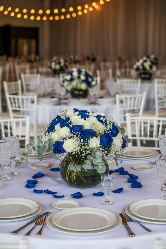 A classic mix of royal blue and white roses creates a timeless centerpiece that feels elegant without being overly complicated. Arranged in a rounded glass vase with touches of baby’s breath and eucalyptus, the floral design feels full and balanced while still allowing the surrounding table settings to shine. Scattered blue rose petals add an extra pop of color across the table, tying the arrangement into the overall reception palette. This style works beautifully for couples who want a romantic royal blue wedding centerpiece that feels traditional, polished, and easy to replicate across multiple tables.