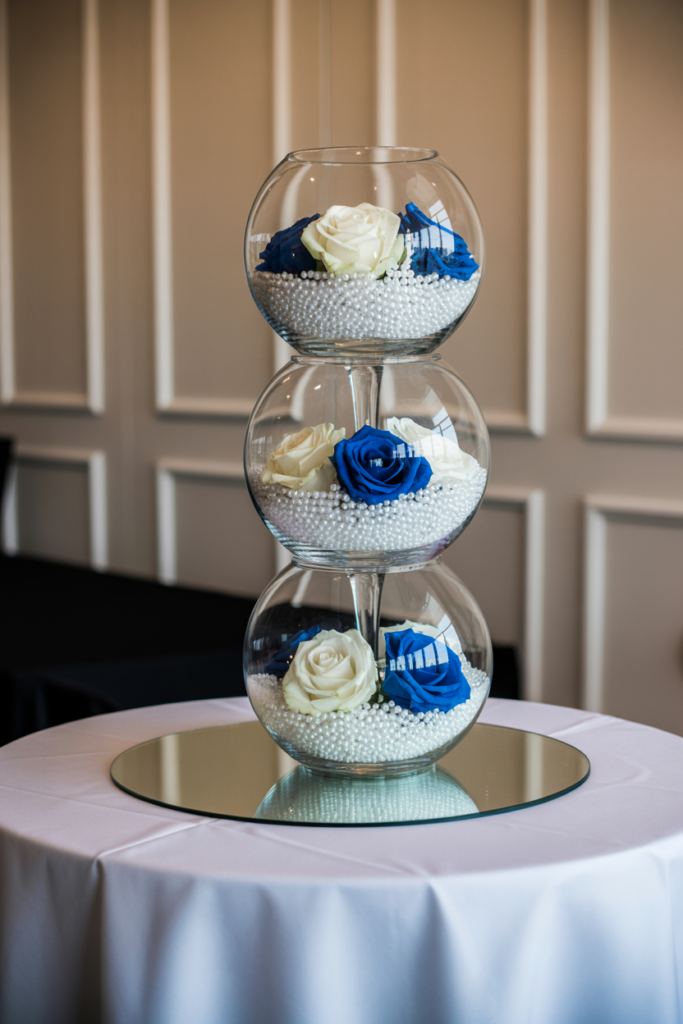 For a modern and sculptural look, stacked glass bowls create a striking royal blue wedding centerpiece that feels clean and sophisticated. Each clear bowl is filled with pearl-like beads and accented with alternating royal blue and ivory roses, giving the design both height and visual balance. The layered structure adds dimension while keeping the overall arrangement minimal and elegant. Placed on a mirrored base, the centerpiece reflects light beautifully and works especially well for formal receptions where simple details can still feel dramatic and polished.