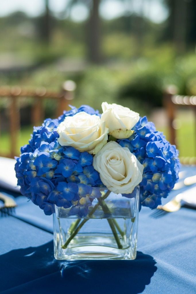 A low arrangement of royal blue hydrangeas and classic white roses creates a centerpiece that feels fresh, romantic, and perfect for outdoor weddings. Placed in a simple square glass vase, the design keeps the table looking polished while still allowing guests to easily see and talk across the table. The deep blue blooms provide rich color while the ivory roses soften the overall look, creating a balanced floral palette. This style works especially well for garden weddings, vineyard receptions, or sunny outdoor celebrations where natural light helps the royal blue tones stand out beautifully.
