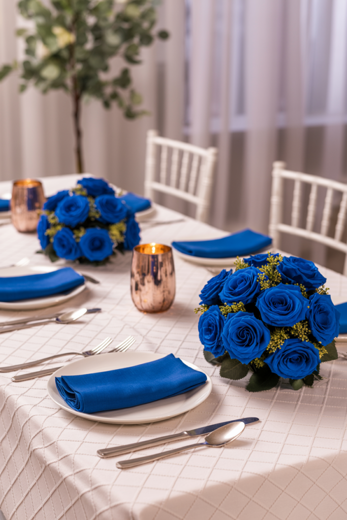 Clusters of royal blue roses create a bold yet elegant centerpiece that instantly ties the table design together. Arranged in a low, rounded bouquet, the vivid blue blooms provide a strong focal point while keeping the table open and comfortable for guests. Paired with matching blue napkins and warm metallic candle holders, the overall look feels coordinated and refined without being overly elaborate. This style works especially well for modern receptions where clean lines, rich color, and simple floral designs create a polished and memorable tablescape.