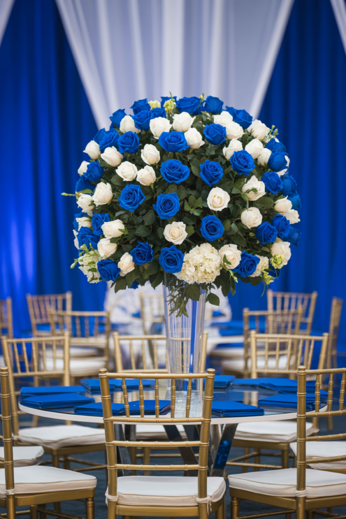 A large arrangement of royal blue and ivory roses creates a stunning centerpiece that instantly elevates the reception space. Designed in a tall glass trumpet vase, the full floral sphere adds height and elegance while keeping the table itself uncluttered. The combination of deep blue roses, soft white hydrangeas, and delicate greenery creates a balanced color palette that feels both dramatic and timeless. Set against rich blue draping and gold chairs, this centerpiece style is perfect for couples planning a formal ballroom wedding with a bold royal blue theme.