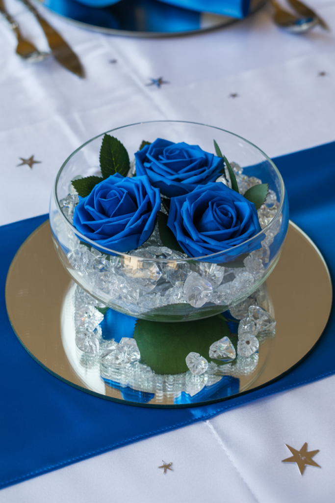 A clear glass bowl filled with sparkling crystal gems and royal blue roses creates a centerpiece that feels modern, simple, and eye-catching. The reflective stones catch the light beautifully, giving the arrangement a subtle shimmer that works especially well under reception lighting. Placed on a mirrored base with a royal blue table runner, the design feels polished while still keeping the floral arrangement minimal. This type of centerpiece is perfect for couples who want a sleek royal blue wedding table design that feels elegant without requiring large or complicated floral displays.
