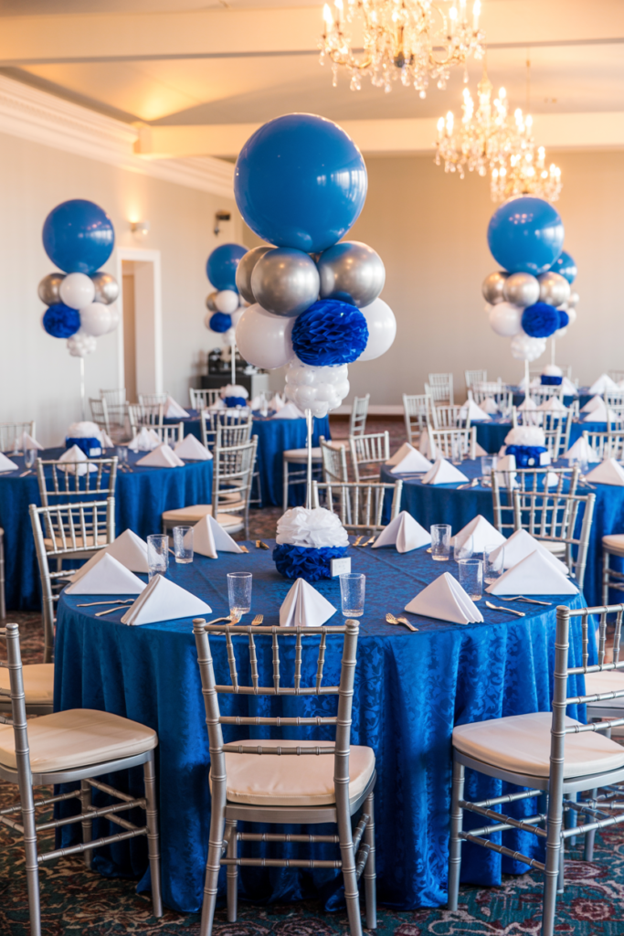 Balloon centerpieces offer a playful and budget-friendly way to incorporate royal blue into your wedding reception tables. This design uses stacked balloons in royal blue, silver, and white to create height and visual impact without relying on large floral arrangements. The tall display draws the eye upward while keeping the table itself uncluttered for place settings and candles. Paired with rich royal blue table linens and crisp white napkins, this centerpiece style works beautifully for modern receptions, engagement parties, or celebratory events where you want a bold pop of color and a fun, festive atmosphere.