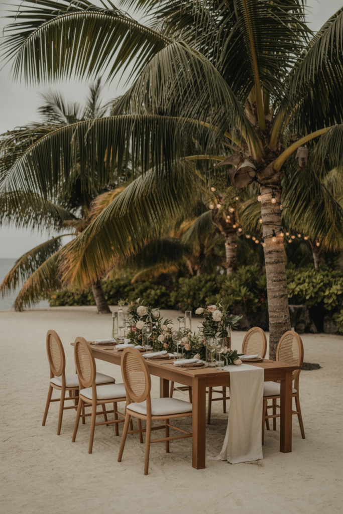 When couples allow the location, climate, and natural textures to guide their design choices, the result feels effortless rather than staged. Soft color palettes, breathable fabrics, organic florals, and thoughtfully chosen details work together to create an atmosphere that’s both relaxed and refined.