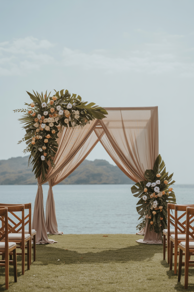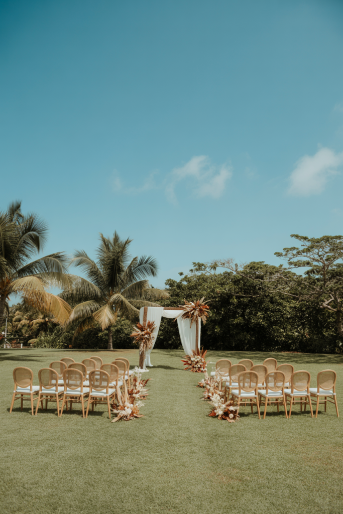 The most memorable tropical wedding ceremonies are designed to frame the setting rather than distract from it. Instead of elaborate structures or heavy décor, couples are opting for airy, intentional elements that enhance what’s already there—whether that’s an ocean horizon, lush greenery, or a sun-drenched courtyard.