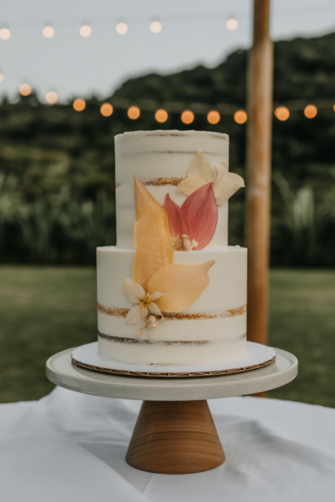 Light, heat-friendly cake styles—such as semi-naked or minimally iced designs—pair beautifully with flavors inspired by the setting, including coconut, citrus, passionfruit, or mango.