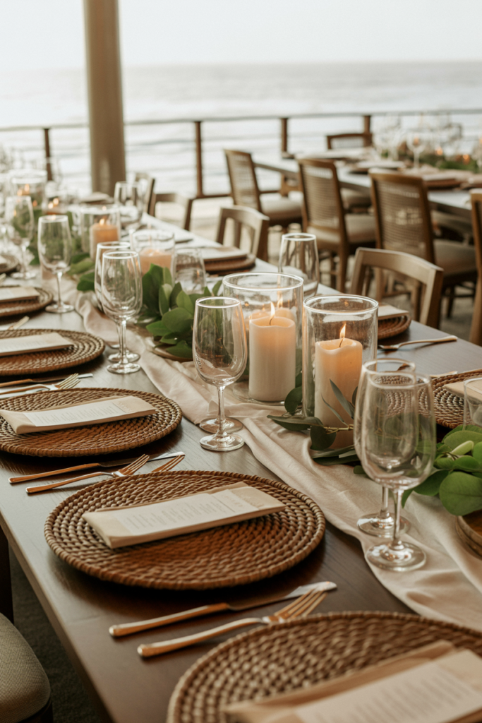 Details like linen napkins, glass hurricane candle holders, and understated table numbers help build atmosphere without visual clutter—pieces that can be sourced thoughtfully, including versatile decor items like woven chargers or clear glass candle hurricanes that transition beautifully from ceremony to reception.
